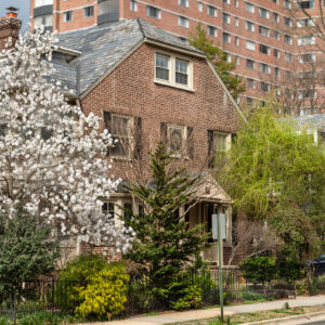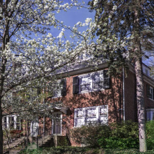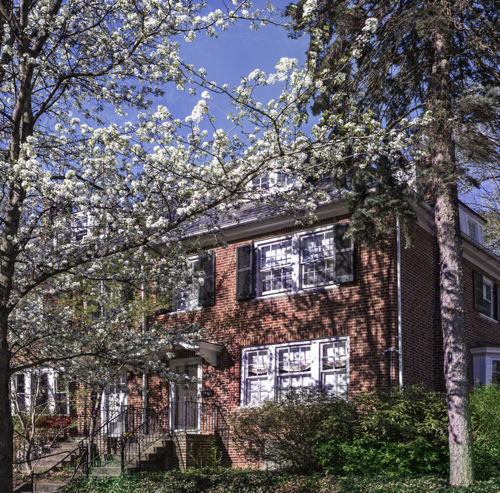 The construction is solid throughout and meant to endure. The homes are varied, some with brick and some with stucco. They were built in groups of two, three, or four, giving the development a more individual appearance than the more normal row house appearance. Hardwood floors and slate roofs bespeak quality as well as durability. The walls are well insulated, so rarely does one hear a sound from the adjacent house. These homes were designed not be dark and gloomy but flooded with light. The east-west exposure allows light to enter all rooms.