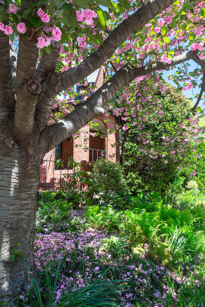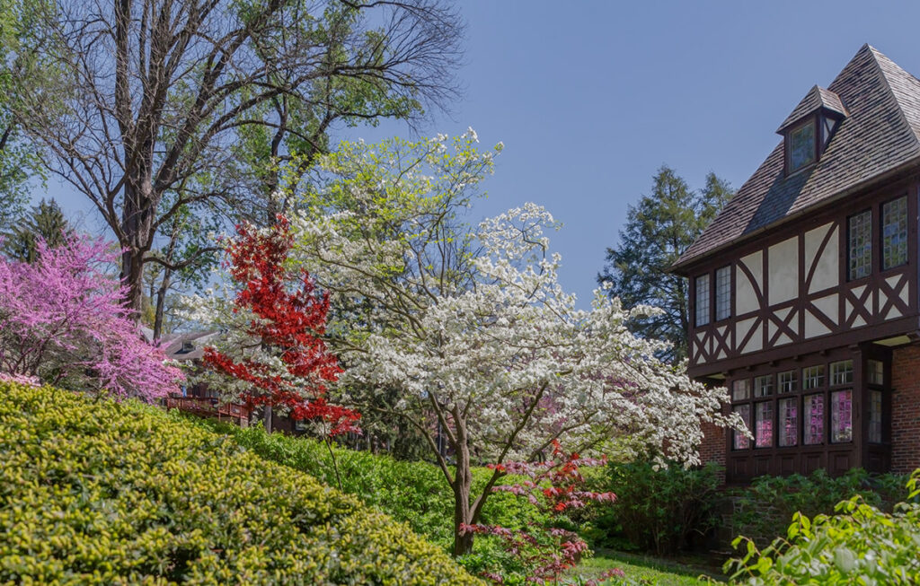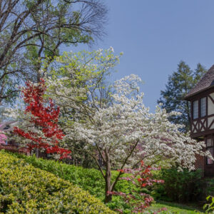 Each townhouse on Ridgemede and Tuscany is different from the others. They have certain features in common: a Tudor design, panes of Venetian glass in leaded casement windows, a fireplace, interesting stone and brickwork, slate roofs, handsome wood trim. On the second floor there is a master bedroom (some with fireplaces) and a bathroom, two other roomy bedrooms, a second bathroom. On the third floor there are two bedrooms, a full bath and large storage closets. Some of the houses have a finished room in the basement with a stone fireplace. Most houses have a garage built into the basement part of the house. There is one group of homes on Tuscany where the garages are built into the hillside.