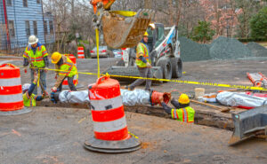 The crew is moving up Stony Run Lane steadily, but has encountered several impediments (pipe line, gas line, electrical cable for the lights, etc crossing the street) so far. Very impressed with how the crew is able to excavate the trench, handle and install the new water pipes, and to fit them under all these other lines.