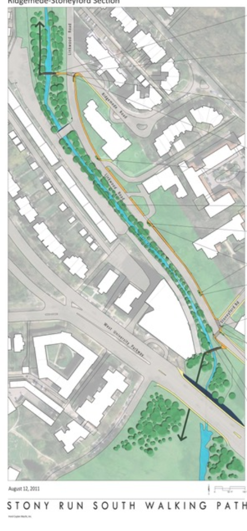 The 2017 “Upper Stony Run Strategic Plan”, published by the Roland Park Community Foundation in partnership with Friends of Stony Run, proposed installation of a new walking path to connect the two bridges. The Strategic Plan states that: “The stretch of Upper Stony Run between Stoneyford Road and Ridgemede Road is the narrowest section of the stream corridor and is constrained by private parking lots on the west side and Linkwood Road on the east side. Consequently, there is very little space to accommodate the walking path. Several concepts for the walking path and its alignment through this area have been explored and should continue to be explored with the adjacent Tuscany-Canterbury Community and adjacent property owners.”