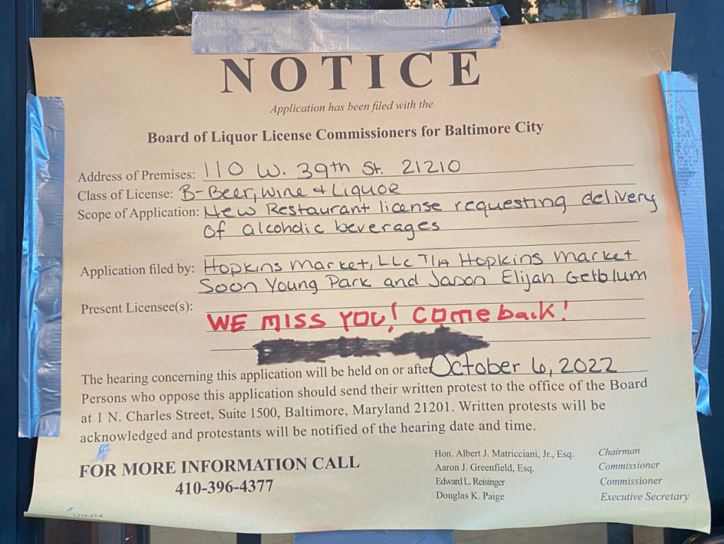 Canterbury looks forward to a new market and deli to replace the former Hopkins Deli at 110 W 39th Street. It appears that the Hopkins Market will be moving into this space. The Hopkins Market LLC was created on May 31, 2022. The same owner of the Hopkins Market also owns the University Market in Charles Village. The Hopkins Market has requested a new Class B restaurant liquor license (6AM–2AM) with an additional request to be able to deliver liquor.
